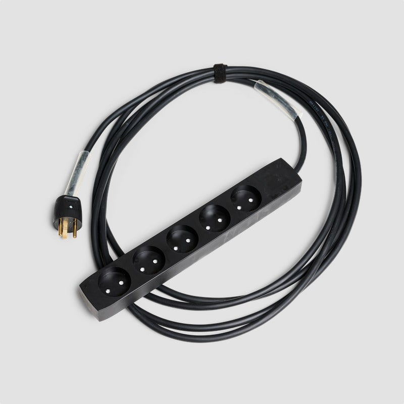 Professionelt forlængerkabel på 5m i H07RN-F 3×1,5mm² gummikabel med slagfast 5-stikdåse og stikprop. Kablet kommer med en tilhørende velcrostrop og to stk. krympeflex.