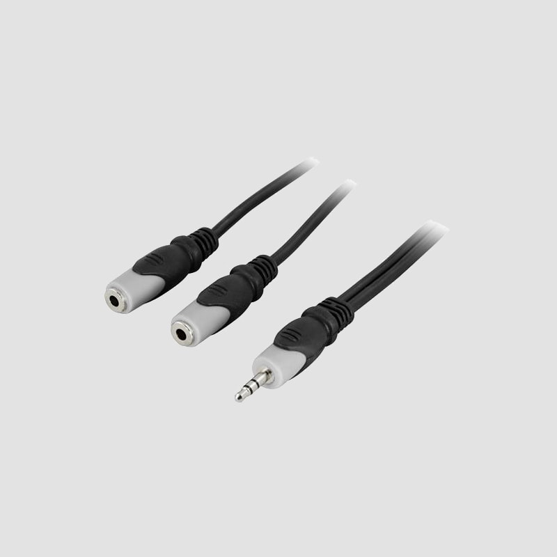 Højkvalitets Y-splitter fra 1×3,5mm han stereo til 2×3,5mm hun stereo. Kan f.eks. bruges til at tilslutte en musikenhed eller en DJ-pult til to sæt hovedtelefoner.