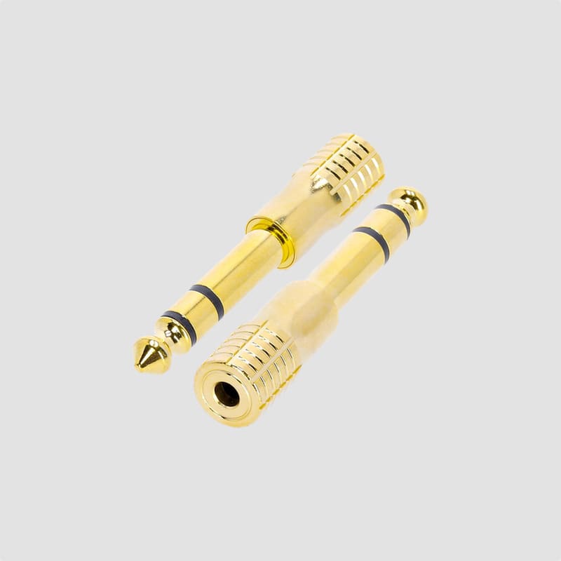 Guldbelagt hovedtelefon adapter fra mini jack hun stereo til 6.3 mm jack han stereo. Stikket som du absolut ikke må mangle på spillejobbet.