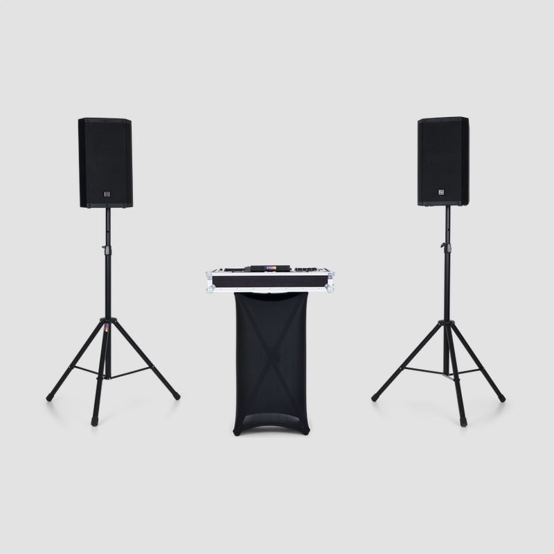 DJ Pakke 1 – RX3,  alt hvad du behøver af DJ udstyr til at spille arrangementer med 50 deltagere. DJ pakken indeholder Pioneer XDJ RX3 DJ pult og 2 højtalere med tilhørende stativer. Alle højtalere har indbygget forstærker. Perfekt pakke løsning hvor DJ udstyret skal være kompakt og diskret.