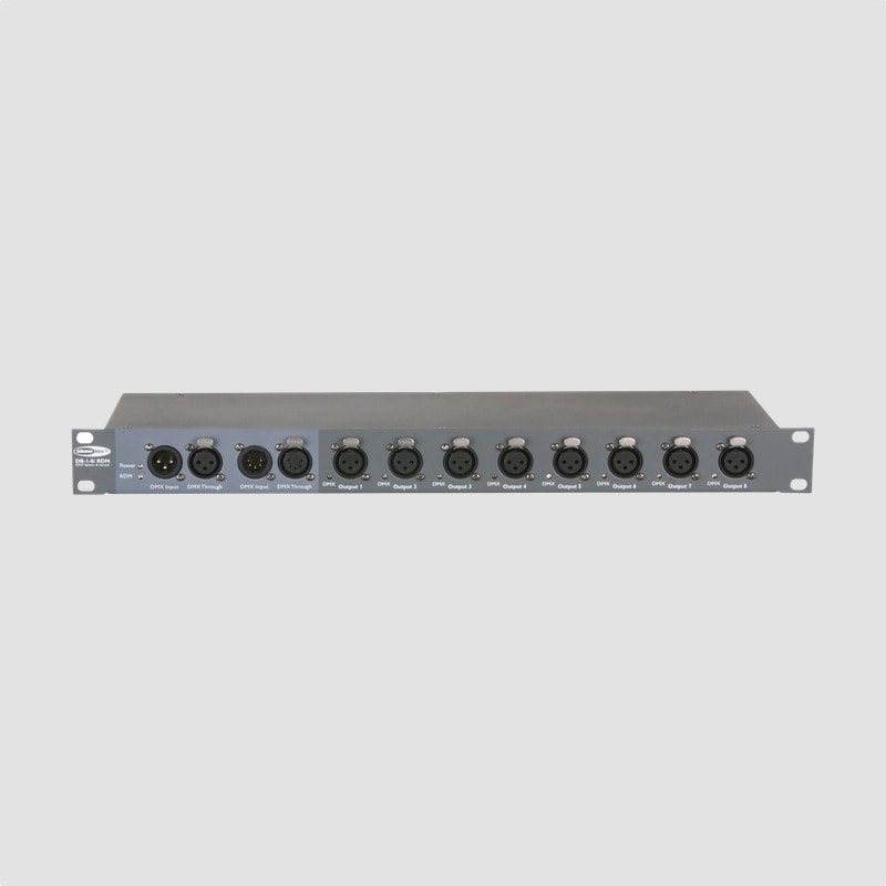 Showtec DMX booster/splitter med både 3- og 5-polet input og link og 8 DMX outputs med LED indikatorer. Kommer i rack med stikpanel.