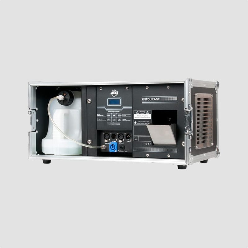 Lej Fazer Røgmaskine. ADJ Entourage er en 1500W professionel Fazer røgmaskine indbygget i en flightcase. En Fazer giver en tynd form for tåge og blæser røgen ud i små mængder, hovedsageligt for at give effekt på lyset. Dette er til forskel for traditionelle røgmaskiner som udsender en røgsky i lokalet. Entourage har en opvarmningstid på kun 45 sekunder og producerer en enorm mængde tåge på op til 425 m³ i minuttet. På LED-displayet styres let timer, blæser og røg. Maskinen har 3- og 5-benet DMX samt Powercon. Den indbyggede tank har en kapacitet på 5,6 liter almindelig vandbaseret røgvæske.