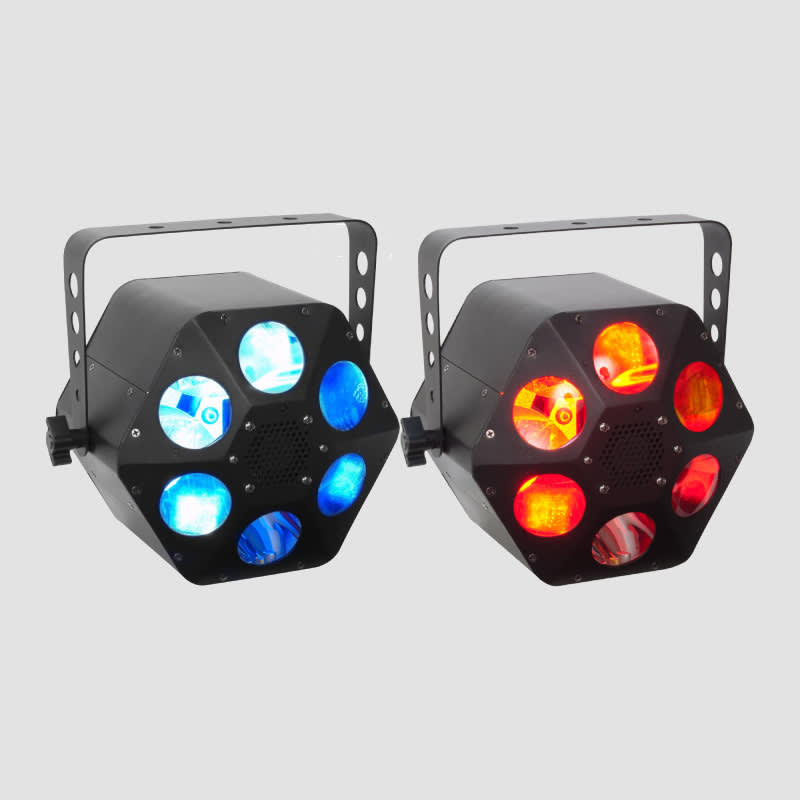 Moonflower er en flot RGBW flower lyseffekt. Den kraftige 32 watts Quad-led udsender mere end 150 roterende, skarpe lysstråler i naturlige farver og fylder ethvert rum og dansegulv. Betjening af lampen foregår enkelt ved hjælp af fire knapper og display. Vælg mellem automatiske funktioner, musikstyring og avanceret DMX-styring med bl.a. rotation, dimmer, strobe og master/slave. DMX-styringen kan betjenes i enten 2 eller 5-kanaler. Moonflower er konstrueret i robust metalhus med universalt monteringsbeslag for let montering. Forbind let flere lamper til hinanden ved hjælp af strøm og DMX ind og udgangene på bagsiden.