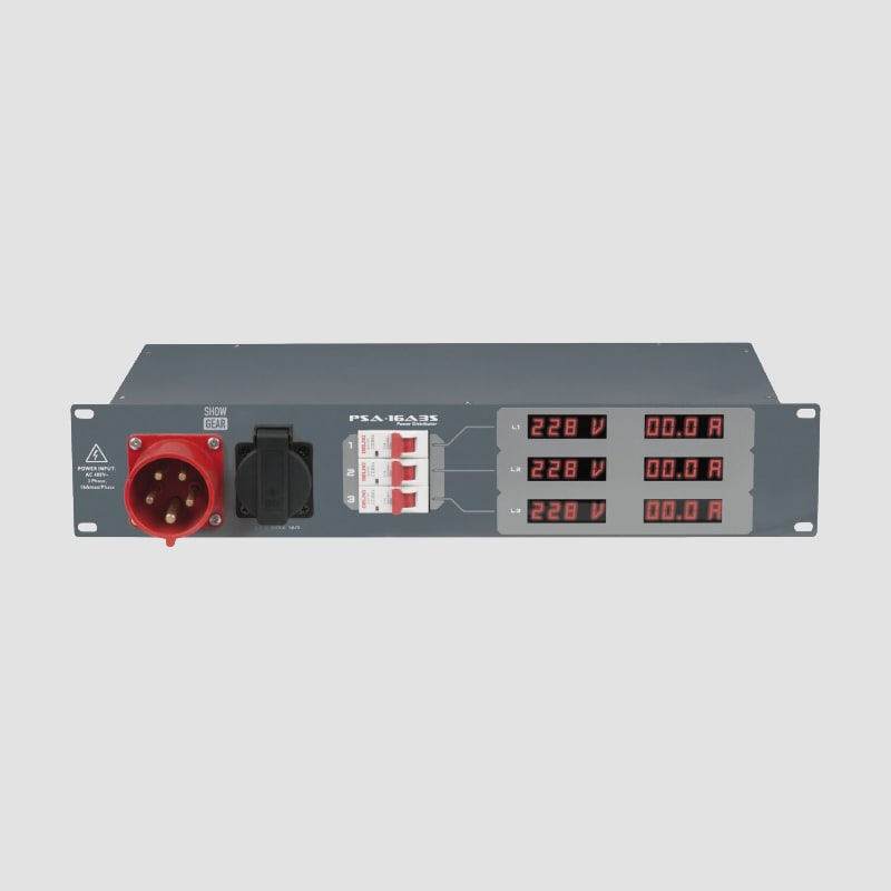 Professionel rackmonteret 16A strøm distributør af høj kvalitet. Strømtavlen er specielt designet til brug i forbindelse med lyd og lysproduktion. Tavlen er forsynet med 3 x C16A automat sikringer og 32A CEE stik på fronten, samt 6 x schuko udtag på bagsiden. Tavlen er produceret i Tyskland, og alle komponenter er nøje udvalgt og opfylder alle relevante sikkerhedskrav.