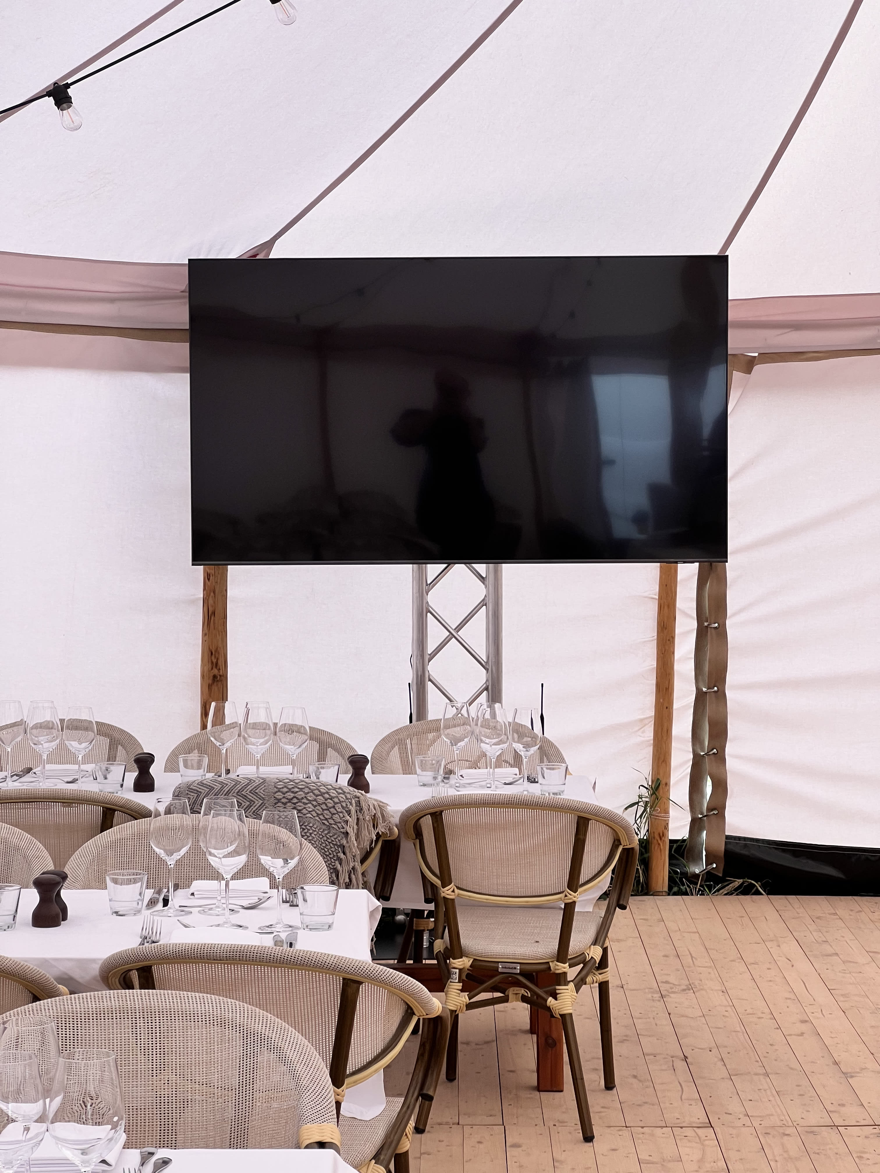 Bemærk: Fladskærm medfølger ikke. Ekstra høj TV-stander til fladskærm, monteret på truss med bundplade. Standeren er 2 m høj og skærmen kan justeres i flere højder op til 2,3 m. Standen erstatter det medfølgende stativ ved leje af Fladskærm 75″.