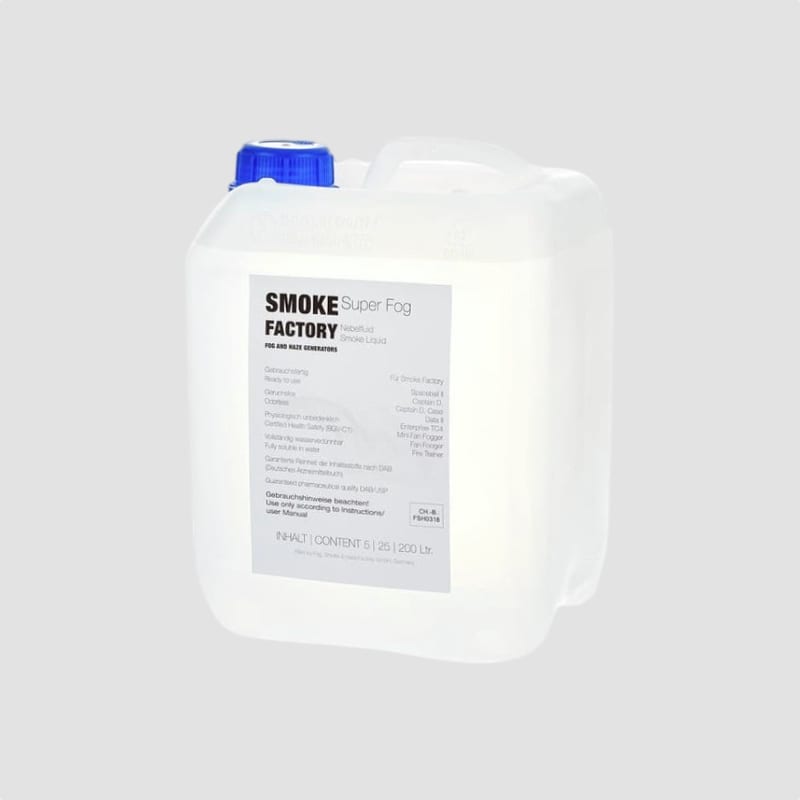 Smoke Factory Super Fog Fluid – 5 liters dunk med skruelåg. Højkvalitets røgvæske, der kan benyttes sammen med alle typer af røgmaskiner. Røgen bliver hængende længe i luften til markering af lyseffekter eller lasershows og røgvæsken er lugtsvag. Væsken danner en tæt tåge og en ”røgsky” i lokalet, som i sig selv danner en flot effekt.